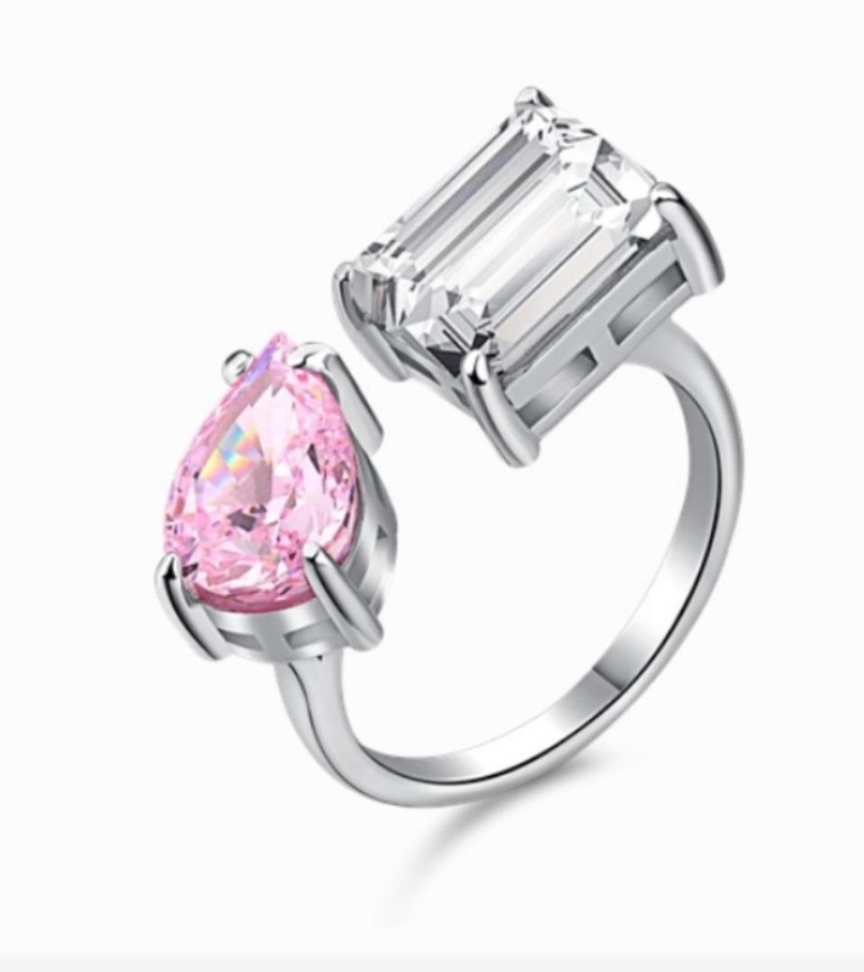 The adjustable design ensures a comfortable and secure fit for any finger size, allowing for versatility and ease of wear. The vibrant pink, green, and clear Cubic Zirconia stones are meticulously set, creating a dazzling display that catches the light beautifully and adds a touch of sophistication to your look.